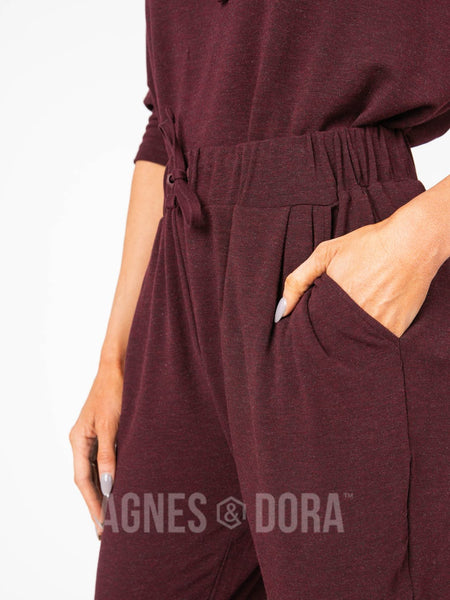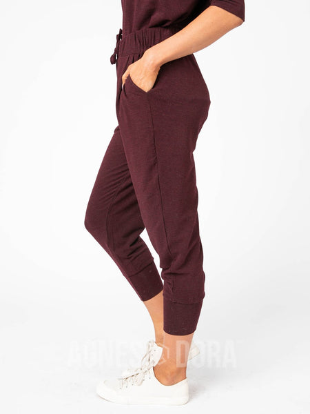 Comfortable crop version of a jogger with a 4" cuff and easy fit. Pull on 2" elastic waistband with functional drawstring, front pockets, and simple side front pleats.