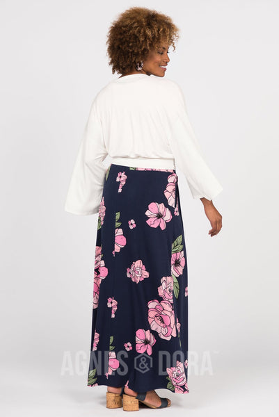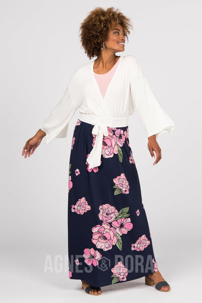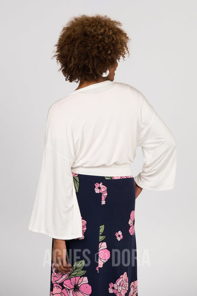 Pull-on crossover surplice bodice with a semi fitted waist with a tie and open dolman sleeves.