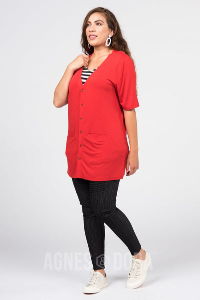 Button front v neck cardigan with half sleeve and front welt pockets.