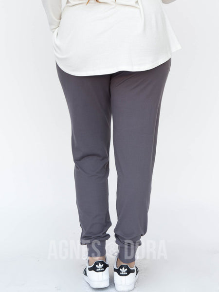 Joggers with 2 1/2" ribbed elastic waistband with functional drawstring and 2 1/2" ribbed ankle cuffs. Slanted pockets.