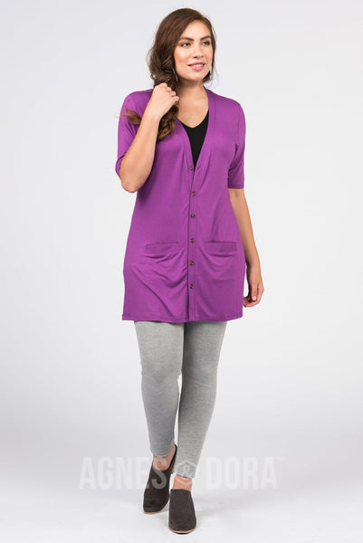 Button front v neck cardigan with half sleeve and front welt pockets.