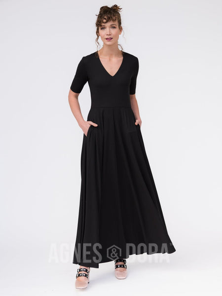 Fitted bodice with natural waistline and Maxi length A-line skirt with side seam pockets.