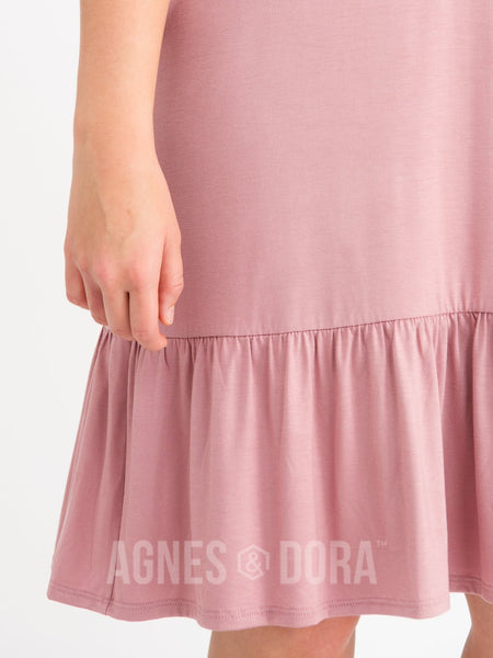 Adjustable length v neck slip dress with 8" ruffle at the hem.