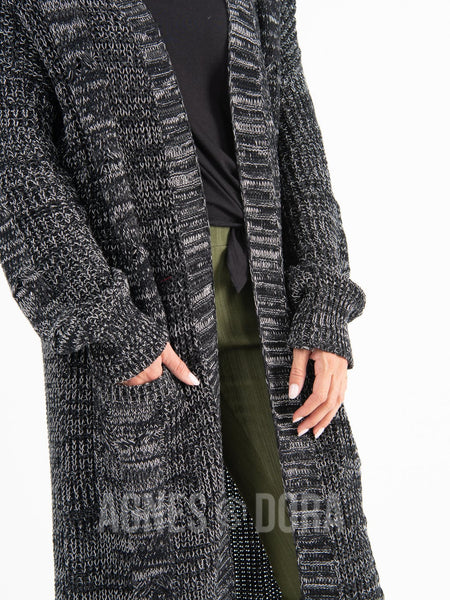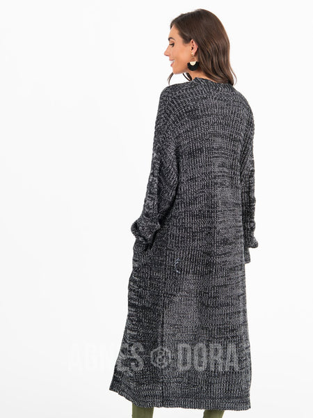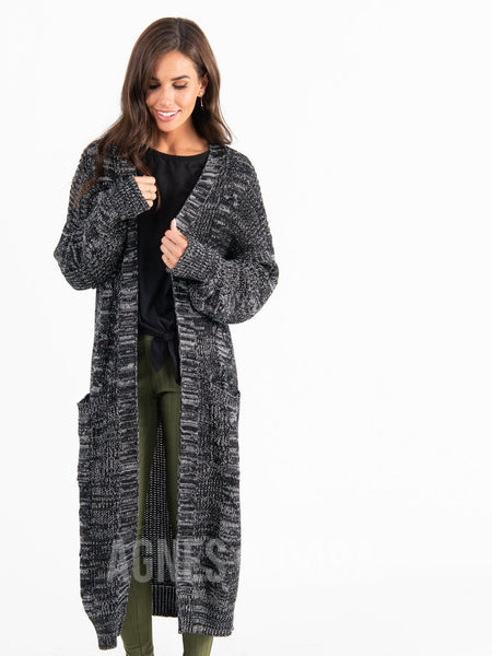 • Open front long sleeve duster cardigan with front patch pockets and cable knit design. Rib knit hem, front band and sleeve cuffs.