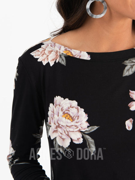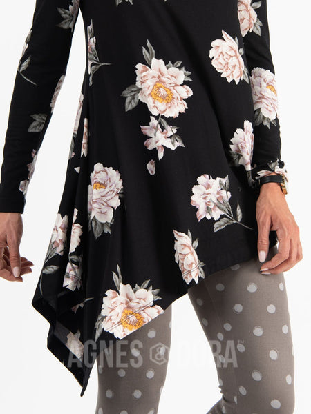 Slight A-line tunic featuring a bateau neckline and long sleeves. 6" slit on the left side seam and asymmetrical draped right hem that extends 9" longer.