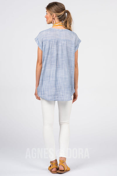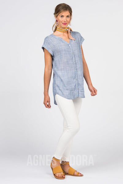 Button front, woven blouse with v neck mandarin collar, semi fitted yoke and cropped cuff sleeves.