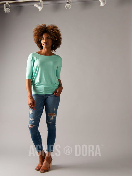 Soft and stretchy top featuring a dolman 3/4 sleeve fitted waist for versatile wear