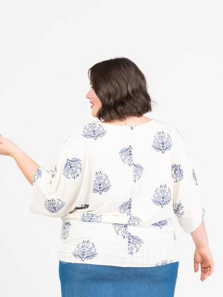 Hip hugging, short dolman sleeve, with a round neckline